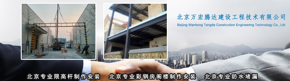 北京萬宏騰達建設工程技術有限公司專業從事高中低檔限高桿制作安裝,專業承接工程、家庭學校醫院彩鋼房閣樓制作安裝,專業防水堵漏,專業劃車位線,24小時咨詢電話:13671253548 北京萬宏騰達建設工程技術有限公司擁有一支高素質、經驗豐富、技術過硬而且服務一流的專業施工隊伍全天候為您服務!歡迎來電咨詢!公司一直堅持“以質量求生存,以信譽謀發展”的企業經營理念和“以人為本,誠信務實”的企業宗旨 北京萬宏騰達建設工程技術有限公司專業閣樓制作安裝,專業彩鋼房安裝,專業鋼結構制作,閣樓樓梯焊接,專業鋼結構閣樓制作,家庭閣樓安裝,加層剛結構閣樓 鋼木制作結構閣樓,鋼結構樓梯制作,陶粒混凝土現澆閣樓.承接大型鋼結構車間廠房,室外鋼結構加層加頂工程,多年制作  更多>>